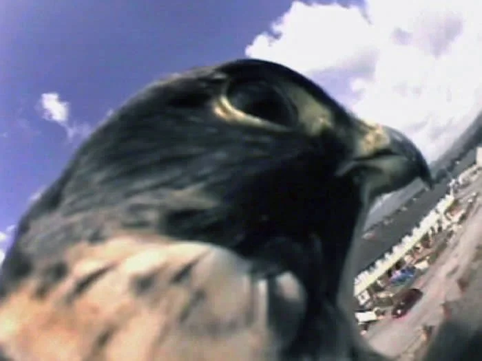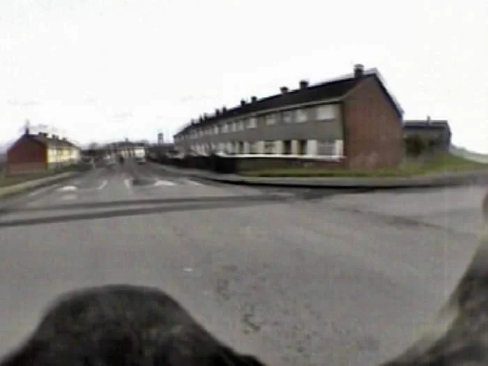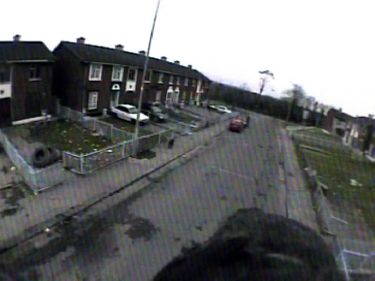 Understanding that falcons are birds of prey and often attack racing pigeons, a special timetable for the skies was agreed with over twenty local loft owners (Concerns were justifiable - previously, falcons nested and bred throughout the 1990s on the spire of Saint John’s Cathedral in Limerick. While the birds were generally popular, members of the local Saint Mary’s racing pigeon club claimed peregrines were killing as many as ten pigeons a day, swooping down from the cathedral spire into coups in backyards of the city.) Then, the falcons took off, with miniature video cameras attached to their bodies. Without the prevalence or availability of drone technology in 2008, this act was commonly viewed as a novel viewpoint. It also made reference to the myth of Sweeney, a figure cursed by the social hierarchy of early medieval Ireland to be half-human, half- bird, to roam the land in a poetic lament to all who affected. The falcons’ free flights acted as a phenomenological recording of the complexity of a place about to potentially disappear under the failed agendas of urban planning, and was subsequently distributed to each house as a DVD disc.